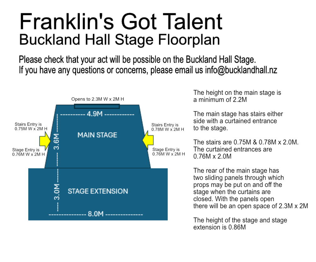- Acts must be able to fit onto the Buckland Hall stage area (please check the stage floorplan)